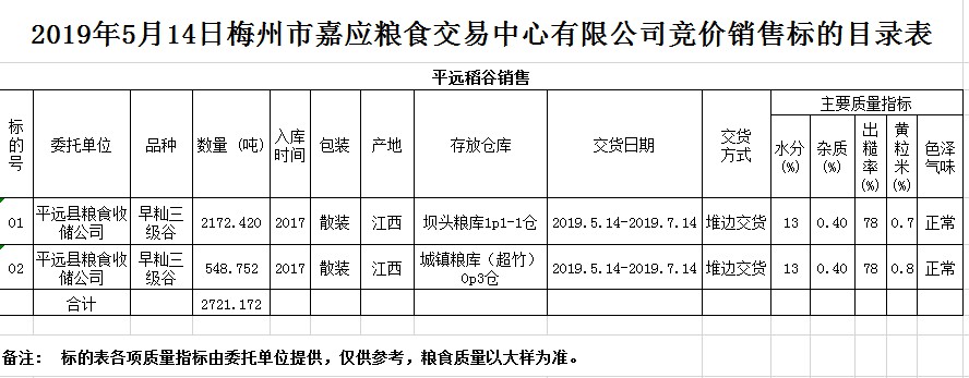 交易時間和地點:20195月14日(星期二)上午10時15分。廣東省梅州市彬芳大道南161號梅州市糧食交易中心3樓。