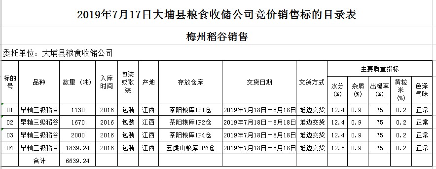 受客戶委托,梅州市嘉應(yīng)糧食交易中心有限公司定于2019年7月17日(星期三)舉辦糧食競價(jià)交易會(huì),大埔縣糧食收儲(chǔ)公司擬銷售2016年早秈稻6639.24噸。