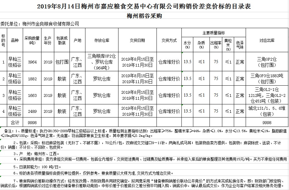 2019年8月14日梅州市金良糧食收儲(chǔ)有限公司稻谷購(gòu)銷(xiāo)價(jià)差聯(lián)動(dòng)標(biāo)的交易會(huì)