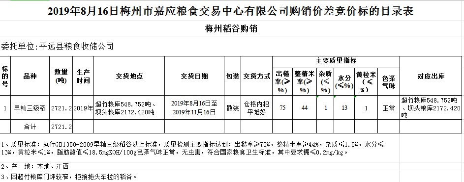 受客戶委托,梅州市嘉應糧食交易中心有限公司定于2019年8月16日(星期五)舉辦稻谷購銷價差聯(lián)動標的交易會,平遠縣糧食收儲公司擬銷售和采購早秈稻2721.2噸。