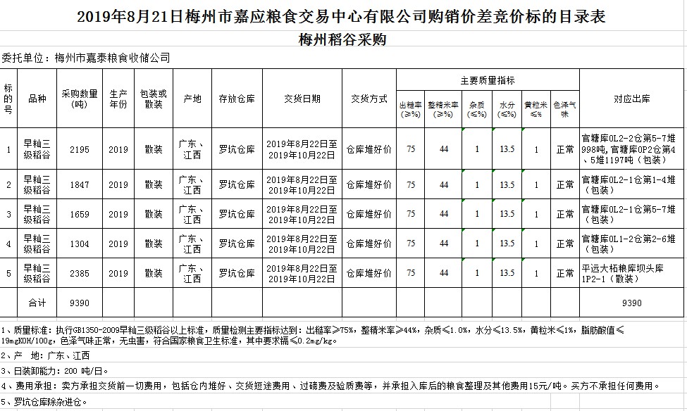 受客戶委托,梅州市嘉應(yīng)糧食交易中心有限公司定于2019年8月21日(星期三)舉辦稻谷購銷價(jià)差聯(lián)動(dòng)標(biāo)的交易會(huì),梅州市嘉泰糧食收儲(chǔ)公司擬銷售和采購早秈稻9390噸。