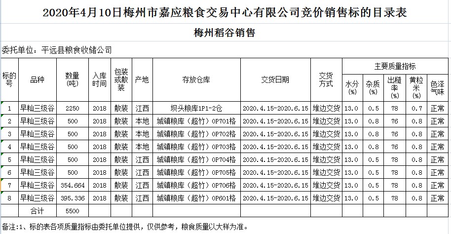 受客戶委托,梅州市嘉應(yīng)糧食交易中心有限公司定于20204月10日(星期五)舉辦糧食競(jìng)價(jià)交易會(huì),平遠(yuǎn)縣糧食收儲(chǔ)公司擬銷售2018年早秈稻5500噸。