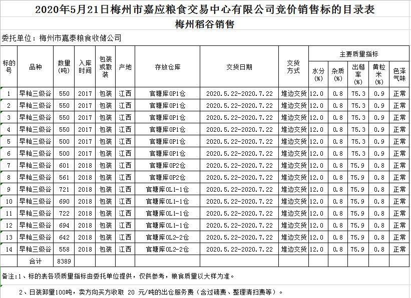 受客戶委托,梅州市嘉應糧食交易中心有限公司定于2020年5月21日(星期四)舉辦糧食競價交易會,梅州市嘉泰糧食收儲公司擬銷售2017年、2018年早秈稻8389噸。