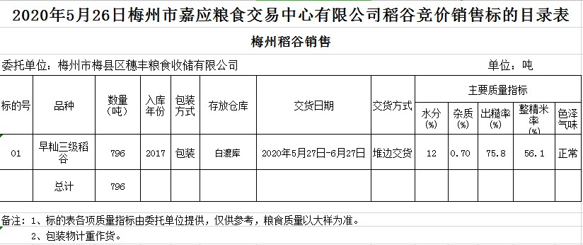 受客戶(hù)委托,梅州市嘉應(yīng)糧食交易中心有限公司定于2020年5月26日(星期二)舉辦糧食競(jìng)價(jià)交易會(huì),梅州市梅縣區(qū)穗豐糧食收儲(chǔ)有限公司擬銷(xiāo)售2017年早秈稻796噸。