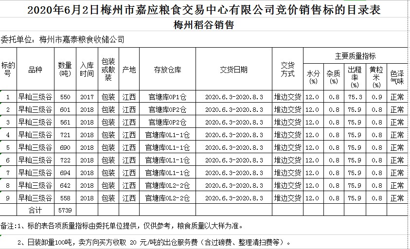2020年6月2日梅州市嘉泰糧食收儲公司稻谷銷售