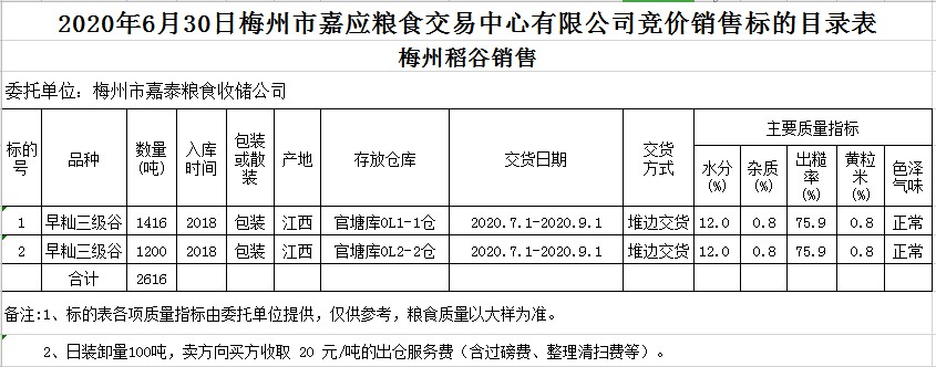受客戶委托,梅州市嘉應糧食交易中心有限公司定于2020年6月30日(星期二)舉辦糧食競價交易會,梅州市嘉泰糧食收儲公司擬銷售2018年早秈稻2616噸。