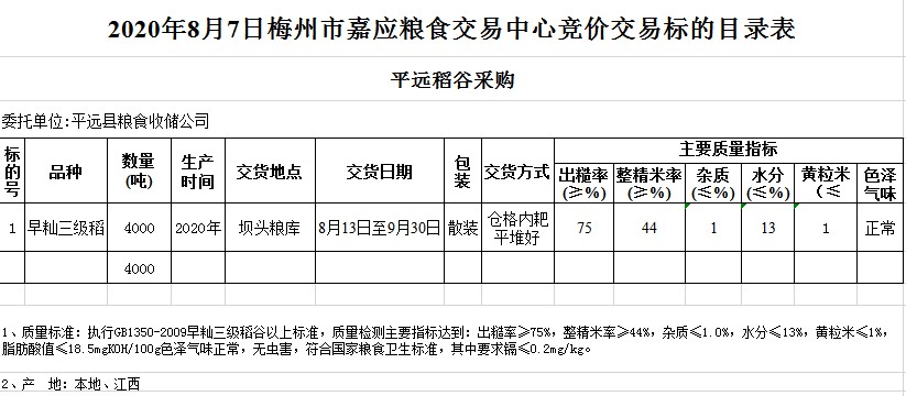 交易時間和地點:2020年8月7日(星期五)上午10時。廣東省梅州市彬芳大道南161號梅州市糧食交易中心3樓。