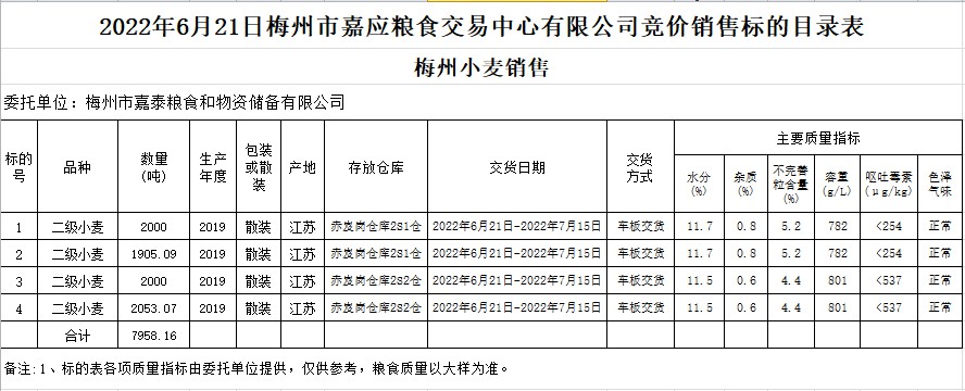 受客戶委托,梅州市嘉應(yīng)糧食交易中心有限公司定于2022年6月21日(星期二)舉辦糧食競價(jià)交易會(huì)。梅州市嘉泰糧食和物資儲(chǔ)備有限公司擬銷售2019年小麥7958.16噸。