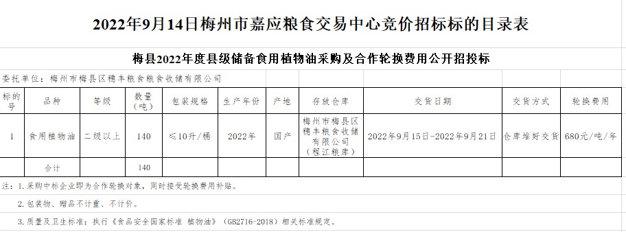 2022年9月14日梅州市梅縣區(qū)穗豐糧食收儲有限公司食用植物油采購及合作輪換費公開競價招標(biāo)公告