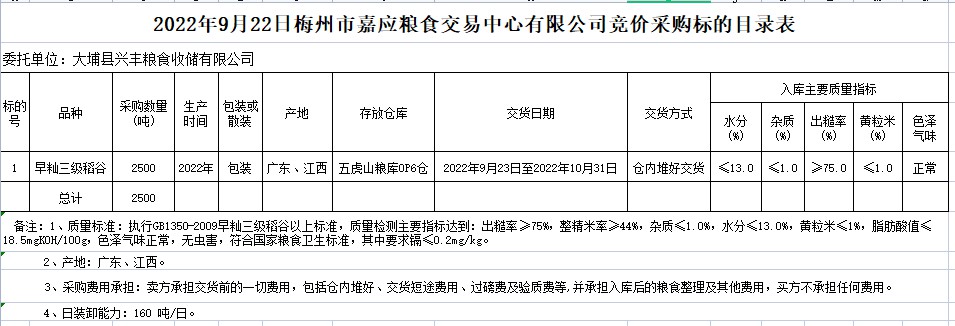 受客戶(hù)委托,梅州市嘉應(yīng)糧食交易中心有限公司定于2022年9月22日(星期四)舉辦糧食競(jìng)價(jià)交易會(huì)。大埔縣興豐糧食收儲(chǔ)有限公司擬采購(gòu)2022年早秈稻2500噸。