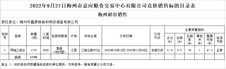 2022年9月27日梅州市嘉泰糧食和物資儲備有限公司稻谷銷售