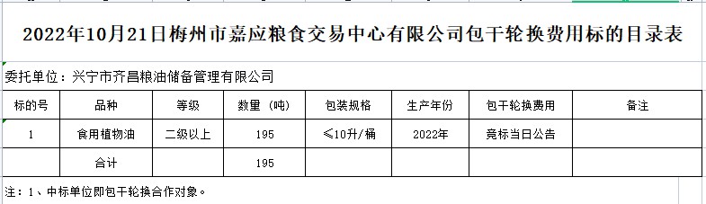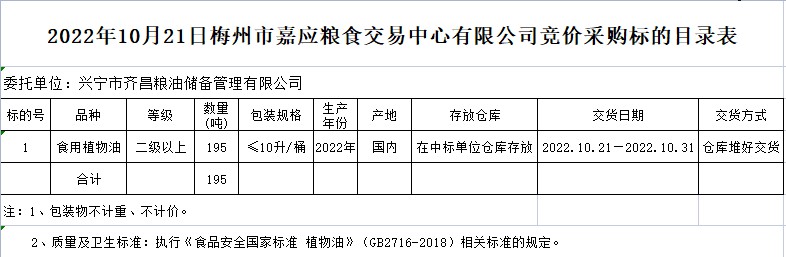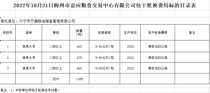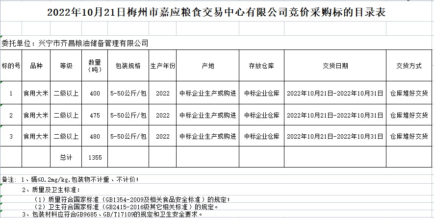 受客戶委托,梅州市嘉應(yīng)糧食交易中心有限公司定于2022年10月21日(星期五)上午10時在廣東省梅州市彬芳大道南161號梅州市糧食交易中心3樓,舉辦興寧市本級成品糧油動態(tài)儲備競價采購及包干輪換費用公開招標。