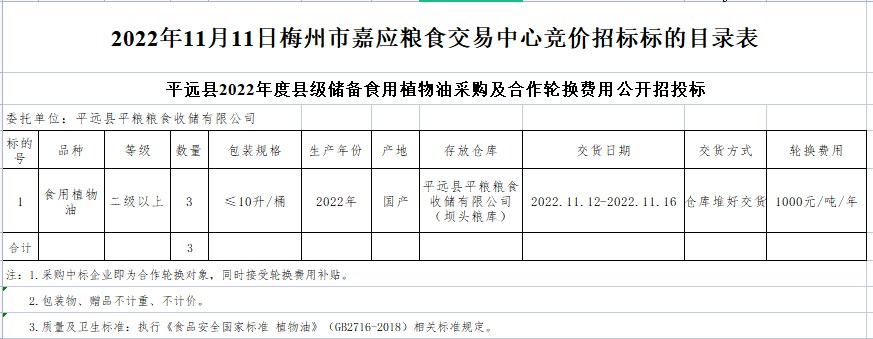 2022年11月11日平遠(yuǎn)縣平糧糧食收儲(chǔ)有限公司食用植物油采購(gòu)及合作輪換費(fèi)公開(kāi)競(jìng)價(jià)招標(biāo)公告