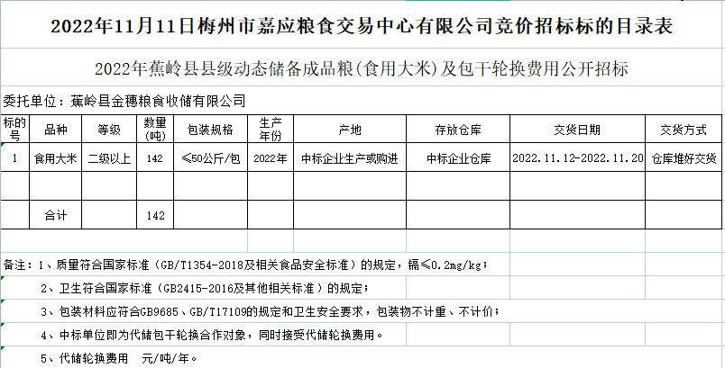 2022年蕉嶺縣縣級(jí)動(dòng)態(tài)儲(chǔ)備成品糧(食用大米)及包干輪換費(fèi)用公開招標(biāo)公告