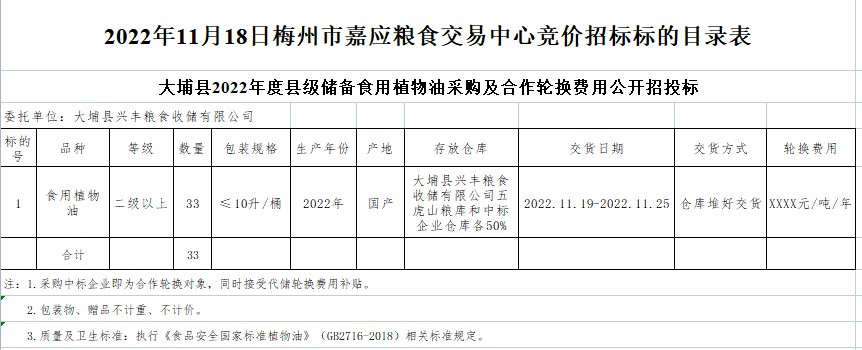 2022年11月18日大埔縣興豐糧食收儲有限公司食用植物油采購及合作輪換費(fèi)公開競價(jià)招標(biāo)公告