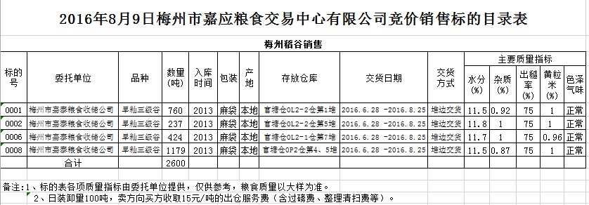 受客戶委托,梅州市嘉應(yīng)糧食交易中心有限公司定于2016年8月9日舉辦糧食競價交易會,梅州市嘉泰糧食收儲公司擬銷售2013年產(chǎn)早秈三級稻谷2600噸。