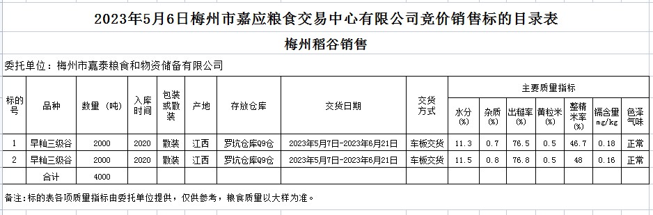 受客戶委托,梅州市嘉應(yīng)糧食交易中心有限公司定于2023年5月6日(星期六)舉辦糧食競(jìng)價(jià)交易會(huì)。梅州市嘉泰糧食和物資儲(chǔ)備有限公司擬銷售2020年早秈稻4000噸。