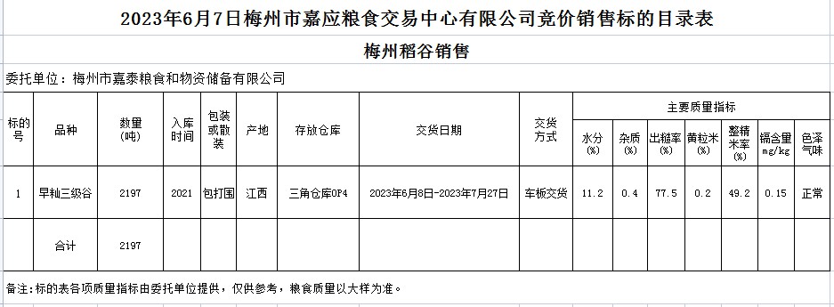 受客戶(hù)委托,梅州市嘉應(yīng)糧食交易中心有限公司定于2023年6月7日(星期三)舉辦糧食競(jìng)價(jià)交易會(huì)。梅州市嘉泰糧食和物資儲(chǔ)備有限公司擬銷(xiāo)售2021年早秈稻2197噸。