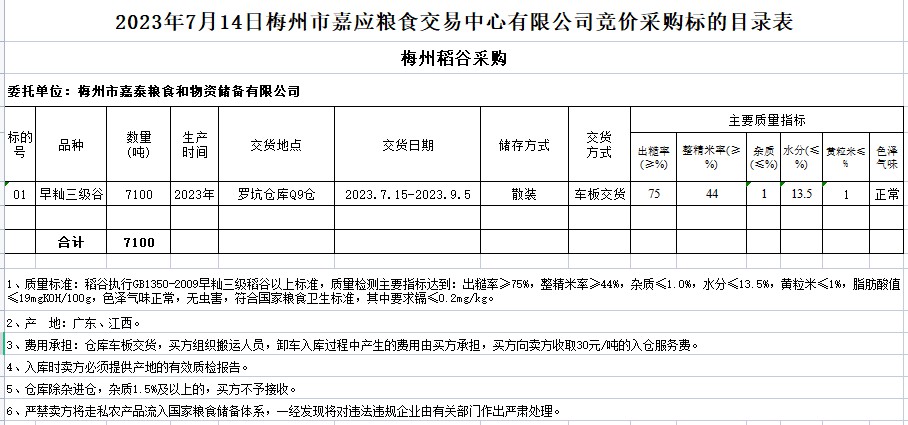 受客戶委托,梅州市嘉應糧食交易中心有限公司定于2023年7月14日(星期五)舉辦糧食競價交易會。梅州市嘉泰糧食和物資儲備有限公司擬采購2023年早秈稻7100噸。