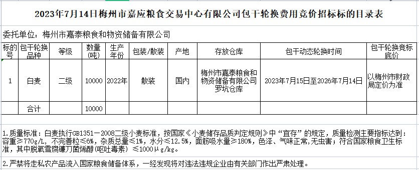 2023年7月14日梅州市2023年度市級(jí)儲(chǔ)備糧包干輪換公開招投標(biāo)公告