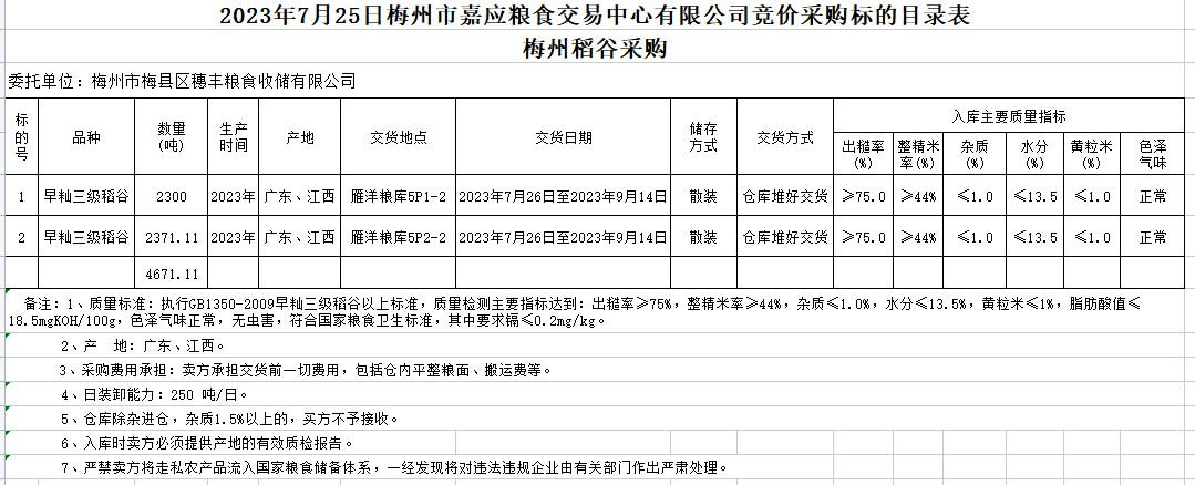 2023年7月25日梅州市梅縣區(qū)穗豐糧食收儲有限公司稻谷采購