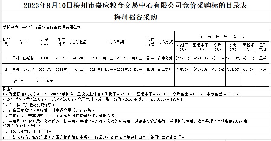受客戶(hù)委托,梅州市嘉應(yīng)糧食交易中心有限公司定于2023年8月10日(星期四)舉辦糧食競(jìng)價(jià)交易會(huì)。興寧市齊昌糧油儲(chǔ)備管理有限公司擬采購(gòu)2023年早秈稻7999.476噸。