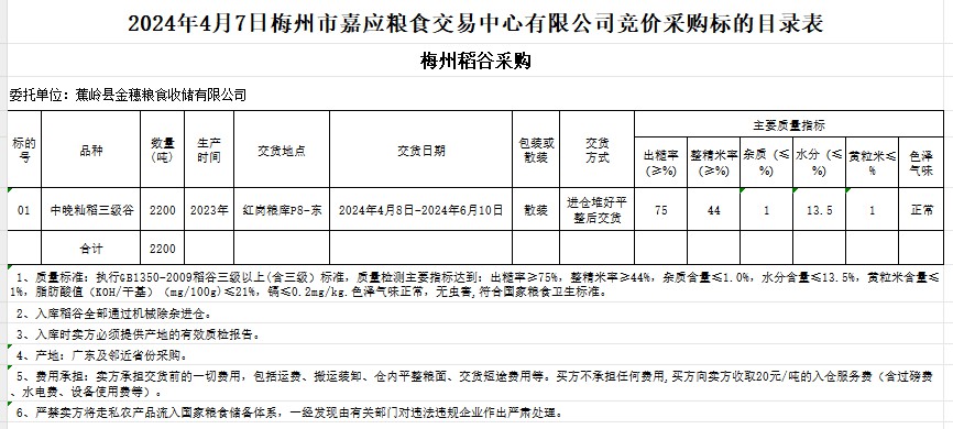 2024年4月7日蕉嶺縣金穗糧食收儲(chǔ)有限公司稻谷采購