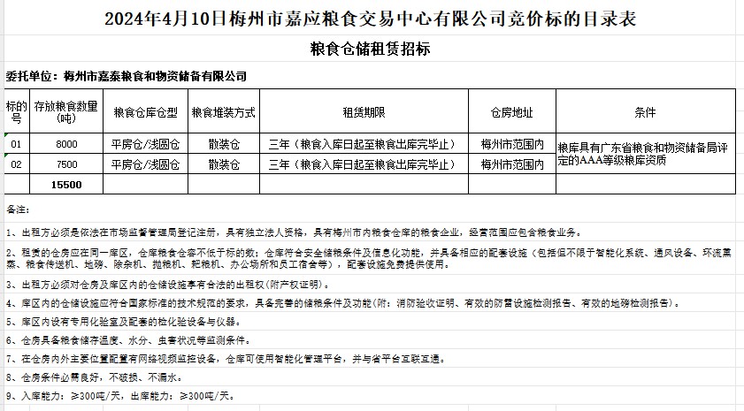 受客戶委托,梅州市嘉應糧食交易中心有限公司定于2024年4月10日(星期三)上午10時在廣東省梅州市彬芳大道南161號梅州市糧食交易中心3樓,舉辦糧食倉儲租賃招標交易會。梅州市嘉泰糧食和物資儲備有限公司擬租賃15500噸糧食倉容及配套設施。