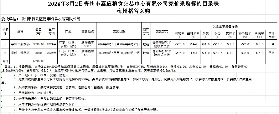 受客戶(hù)委托,梅州市嘉應(yīng)糧食交易中心有限公司定于2024年8月2日(星期五)舉辦糧食競(jìng)價(jià)交易會(huì)。梅州市梅縣區(qū)穗豐糧食收儲(chǔ)有限公司擬采購(gòu)2024年產(chǎn)早秈稻6696.08噸。