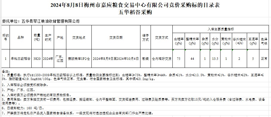 2024年8月8日五華縣琴江糧油收儲(chǔ)管理有限公司稻谷采購(gòu)