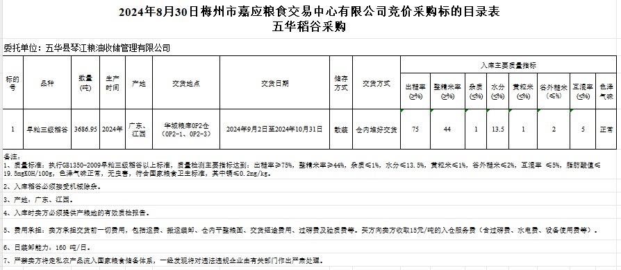 受客戶委托,梅州市嘉應(yīng)糧食交易中心有限公司定于2024年8月30日(星期五)舉辦糧食競價交易會。五華縣琴江糧油收儲管理有限公司擬采購2024年產(chǎn)早秈稻谷3686.95噸。