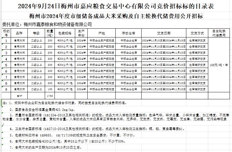 梅州市2024年度市級儲備成品大米采購及自主輪換代儲費用公開招標公告
