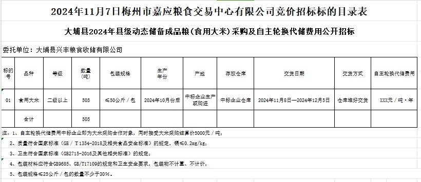 大埔縣2024年縣級動(dòng)態(tài)儲(chǔ)備成品糧(食用大米)采購及自主輪換代儲(chǔ)費(fèi)用公開招標(biāo)公告