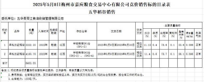 受客戶(hù)委托,梅州市嘉應(yīng)糧食交易中心有限公司定于2025年5月8日(星期四)舉辦糧食競(jìng)價(jià)交易會(huì)。五華縣琴江糧油收儲(chǔ)管理有限公司擬銷(xiāo)售2022年產(chǎn)早秈稻谷6403.05噸。