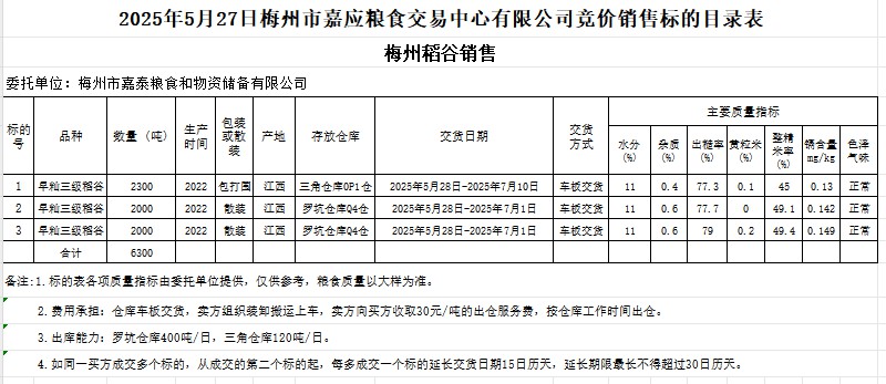 受客戶(hù)委托,梅州市嘉應(yīng)糧食交易中心有限公司定于2025年5月27日(星期二)舉辦糧食競(jìng)價(jià)交易會(huì)。梅州市嘉泰糧食和物資儲(chǔ)備有限公司擬銷(xiāo)售2022年產(chǎn)早秈稻谷6300噸。