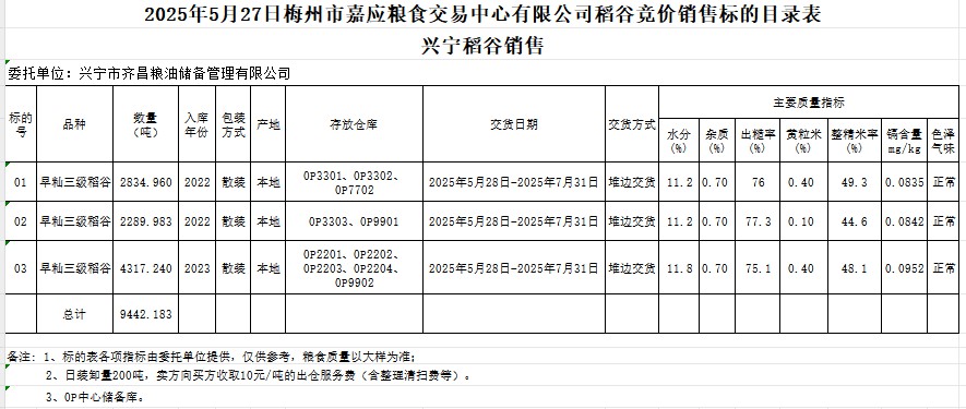 受客戶委托,梅州市嘉應糧食交易中心有限公司定于2025年5月27日(星期二)舉辦糧食競價交易會。興寧市齊昌糧油儲備管理有限公司擬銷售2022年、2023年產早秈稻谷9442.183噸。