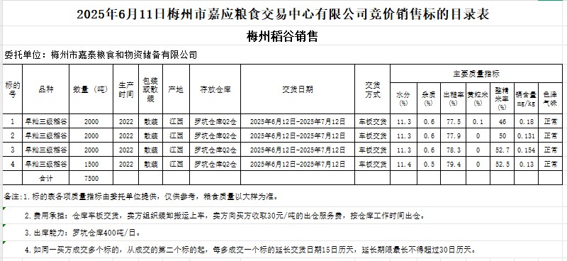 受客戶(hù)委托,梅州市嘉應(yīng)糧食交易中心有限公司定于2025年6月11日(星期三)舉辦糧食競(jìng)價(jià)交易會(huì)。梅州市嘉泰糧食和物資儲(chǔ)備有限公司擬銷(xiāo)售2022年產(chǎn)早秈稻谷7500噸。
