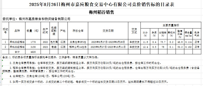 受客戶委托,梅州市嘉應糧食交易中心有限公司定于2025年8月26日(星期二)舉辦糧食競價交易會。梅州市嘉泰糧食和物資儲備有限公司擬銷售2022年、2023年產早秈稻谷4920噸。