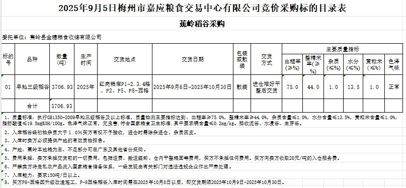 受客戶委托,梅州市嘉應糧食交易中心有限公司定于2025年9月5日(星期五)舉辦糧食競價交易會。蕉嶺縣金穗糧食收儲有限公司采購2025年產(chǎn)早秈稻谷3706.93噸。