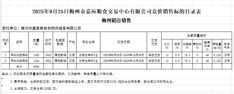 受客戶委托,梅州市嘉應(yīng)糧食交易中心有限公司定于2025年9月25日(星期四)舉辦糧食競(jìng)價(jià)交易會(huì)。梅州市嘉泰糧食和物資儲(chǔ)備有限公司擬銷售2022年產(chǎn)早秈稻谷2844噸。
