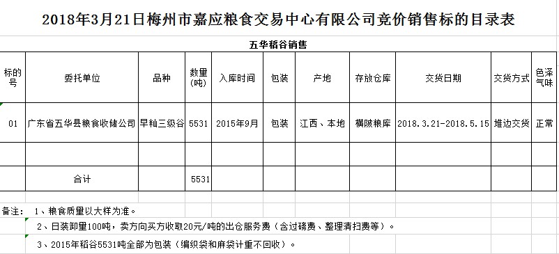 2018年3月21日廣東省五華縣糧食收儲公司稻谷銷售