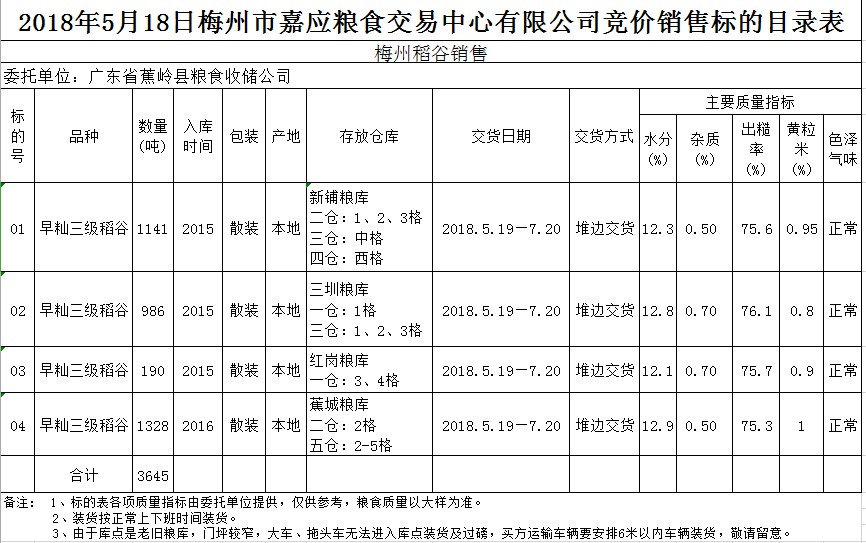 2018年5月18日廣東省蕉嶺縣糧食收儲公司稻谷銷售