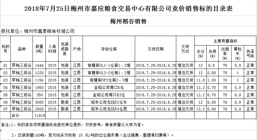 交易時(shí)間和地點(diǎn):2018年7月25日(星期三)上午10時(shí)。廣東省梅州市彬芳大道南161號梅州市糧食交易中心3樓。